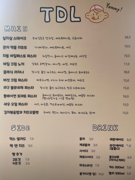 대전 서구 갈마동 레스토랑 TDL은 파스타와 스테이크 중심으로 구성된 양식 메뉴를 운영합니다.
