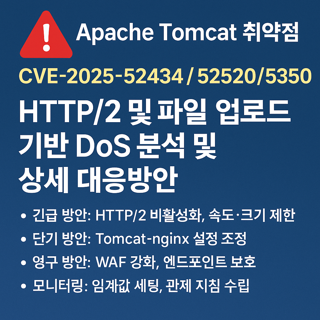 Apache Tomcat에서 보고된 세 건의 DoS 취약점(CVE-2025-52434, CVE-2025-52520, CVE-2025-53506)은 HTTP/2 처리 로직, APR/Native 모듈, 파일 업로드 처리에서 리소스 고갈을 유발할 수 있는 결함들입니다. 이 문서는 취약점 요약과 함께 즉시 적용 가능한 긴급 대책, Tomcat 및 프록시 설정 예제, WAF/IDS 규칙, 모니터링·탐지 및 장기 개선 권고를 통합한 실무용 대응 가이드를 제공합니다.