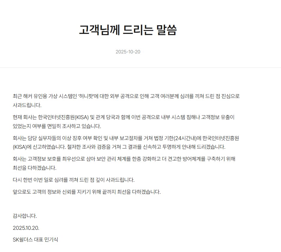 2025.10.20 - [IT 소식 뉴스/IT 소식] - SK쉴더스, 해커 유인하려다 오히려 해킹