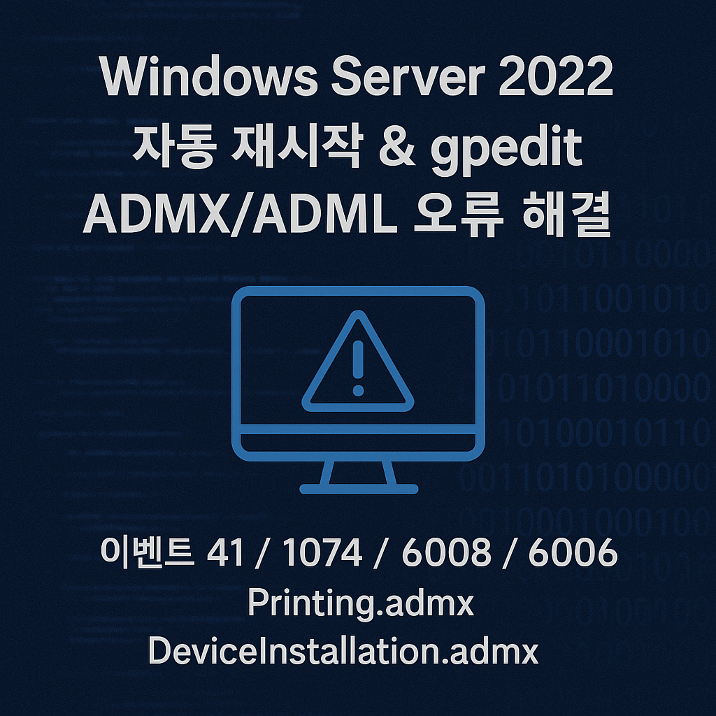 Windows Server 2022 VM 환경에서 자동 재시작이 반복 발생하였고, 그룹 정책 편집기(gpedit.msc) 실행 중 ADMX/ADML 리소스 불일치 오류가 발생한 사례이다. 본 보고서는 실제 로그 기반으로 원인과 조치 과정을 정리하였다.